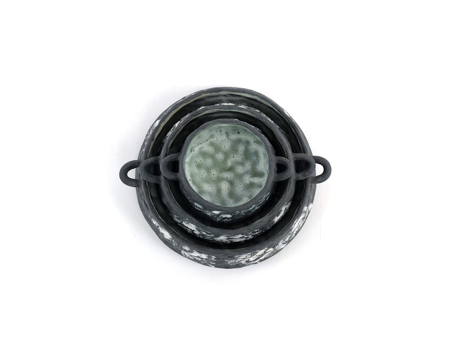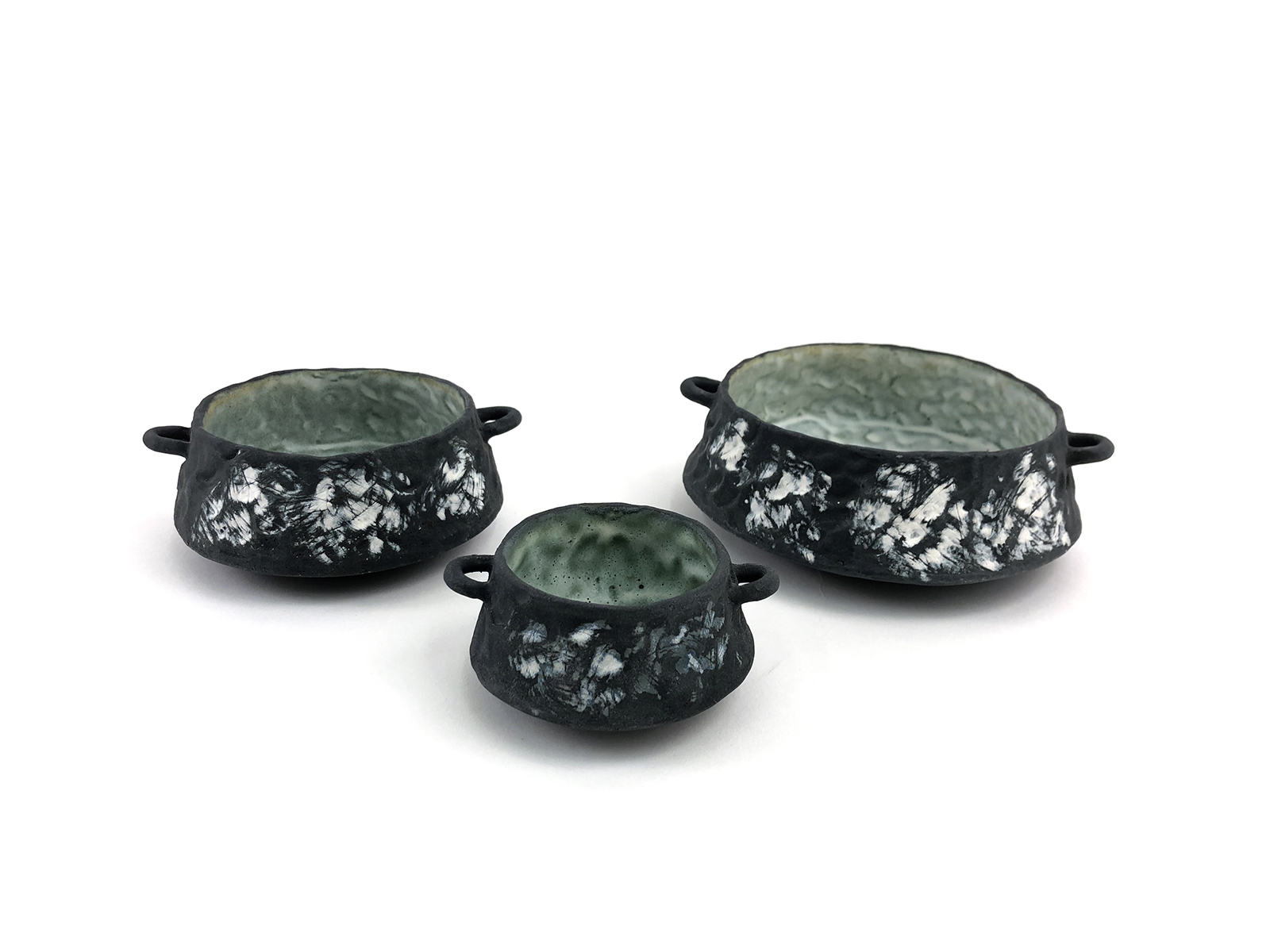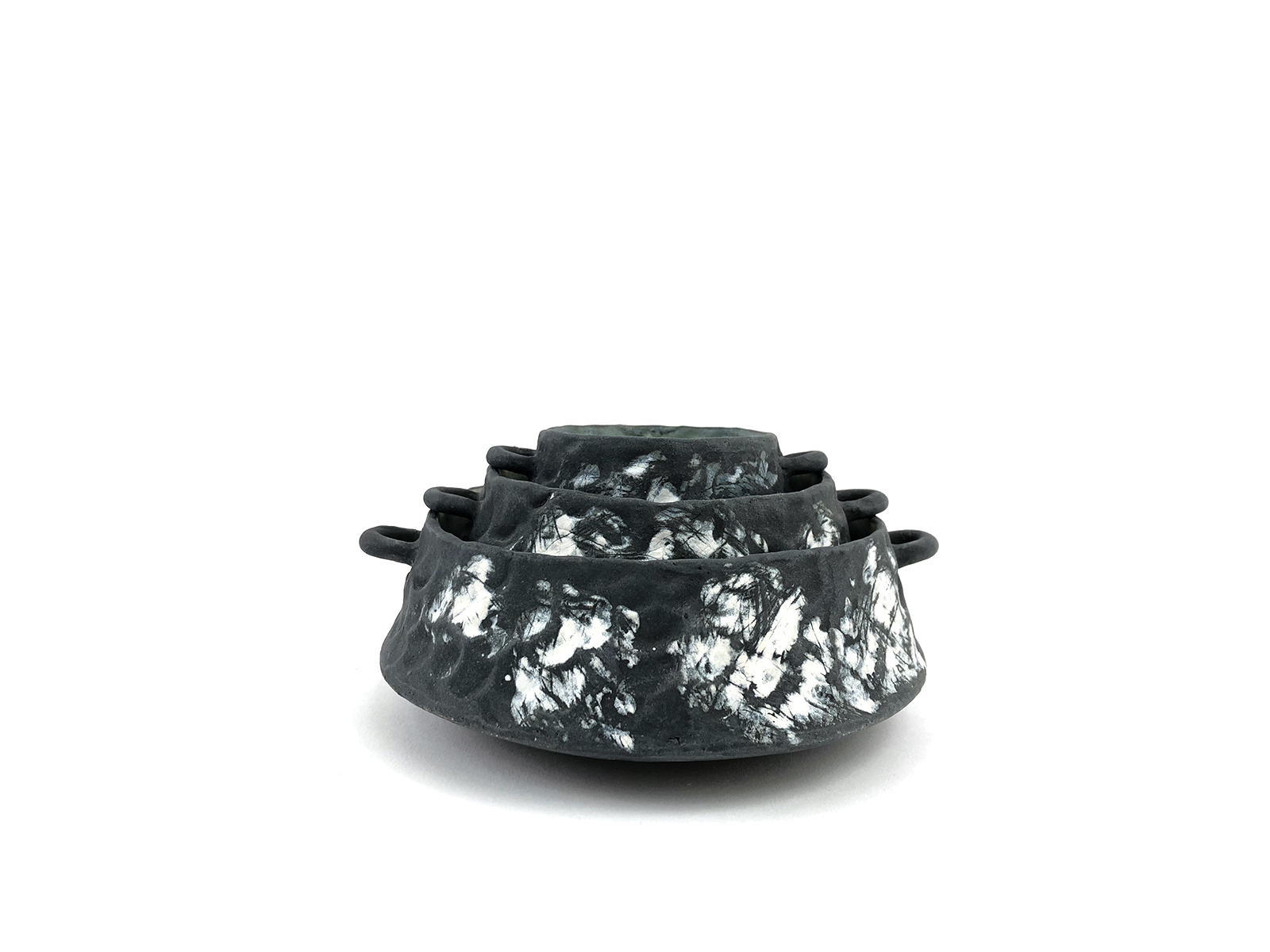 Σετ τριών κεραμικών δοχείων με διακοσμητικά χερούλια, εμπνευσμένο από μεταλλικά παραδοσιακά σκεύη.