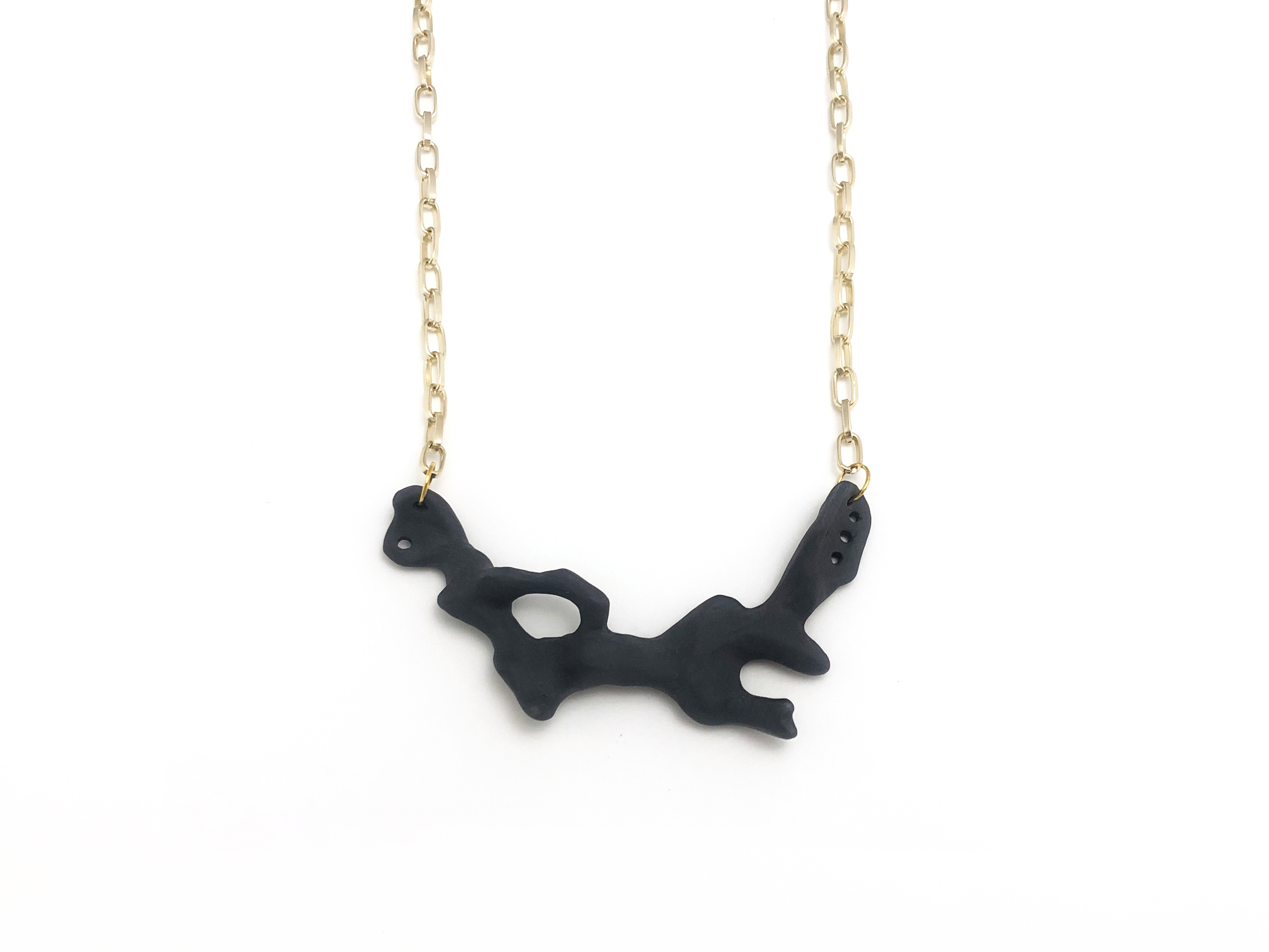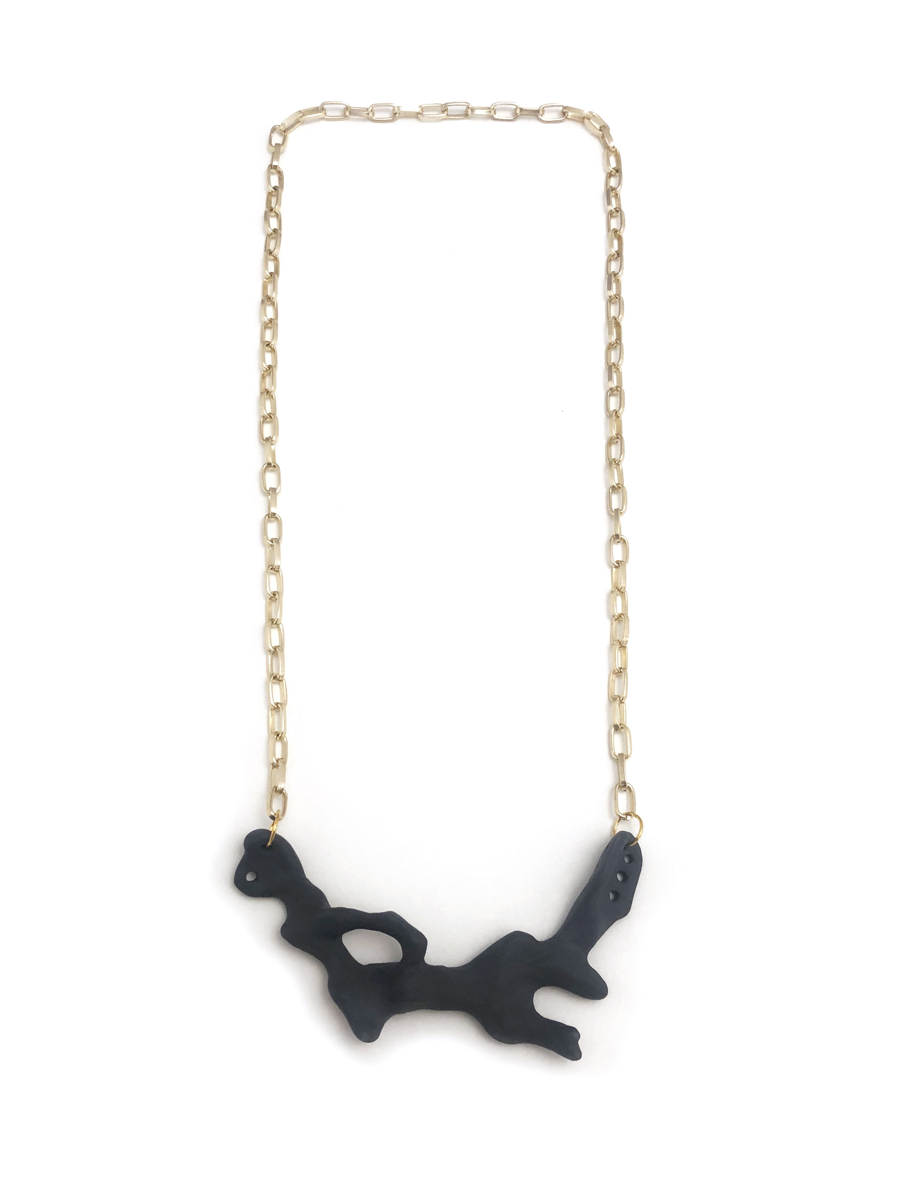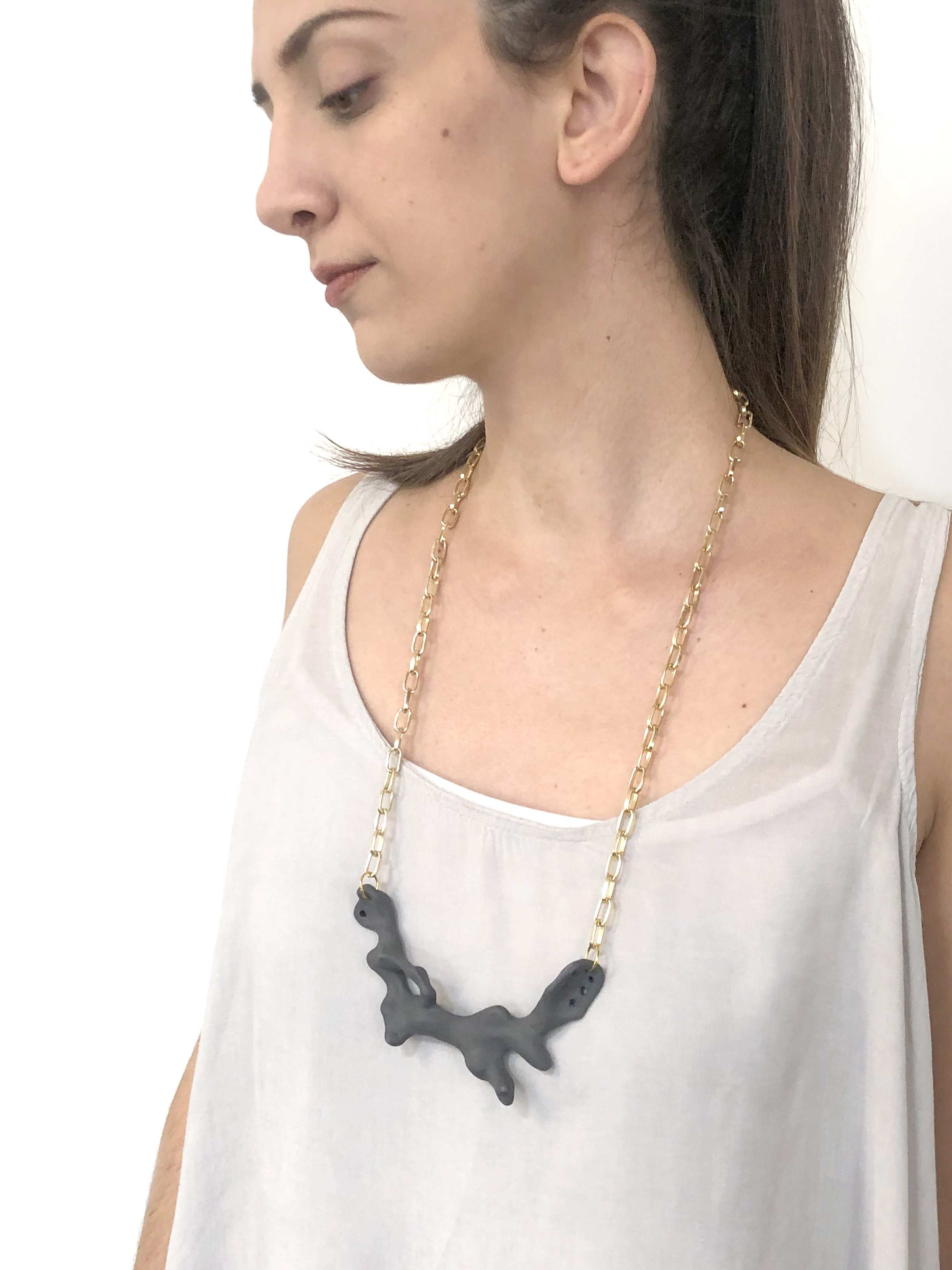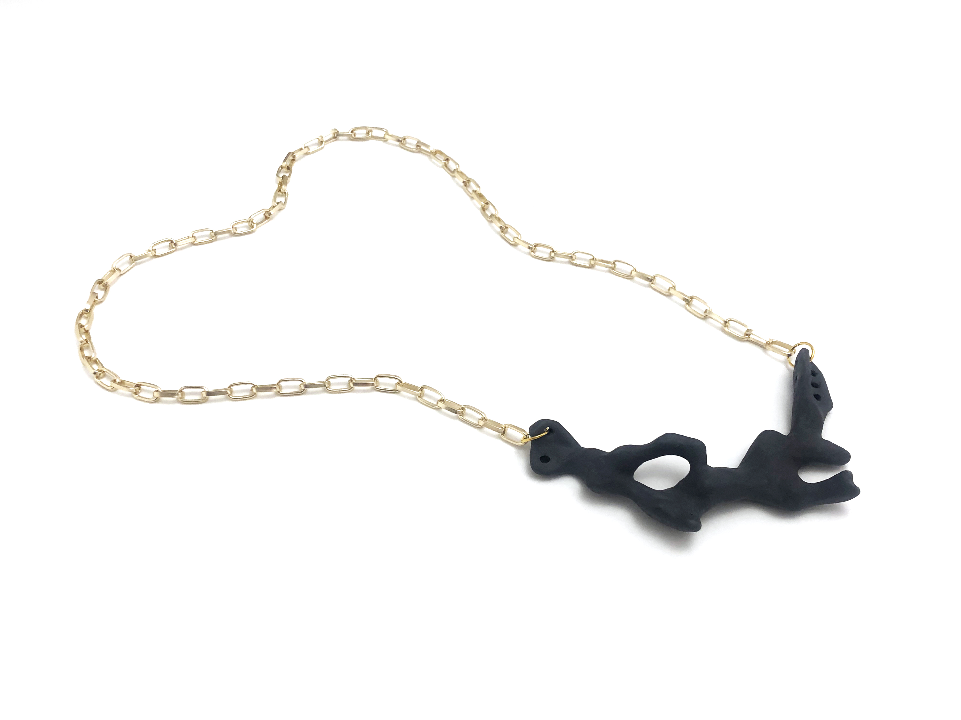 Γλυπτό κολιέ με μαύρη πορσελάνη και χρυσαφί αλυσίδα αλουμινίου.
