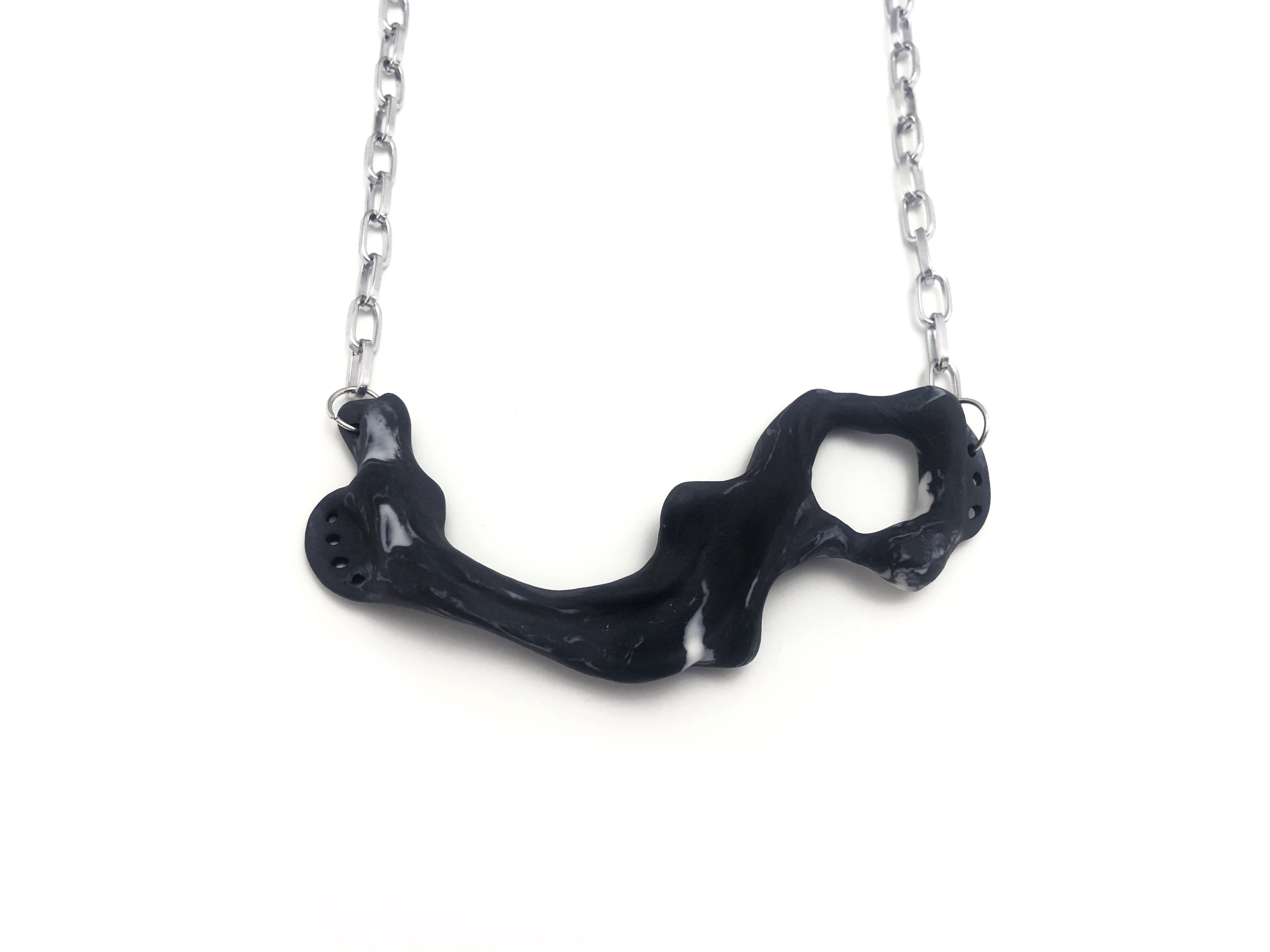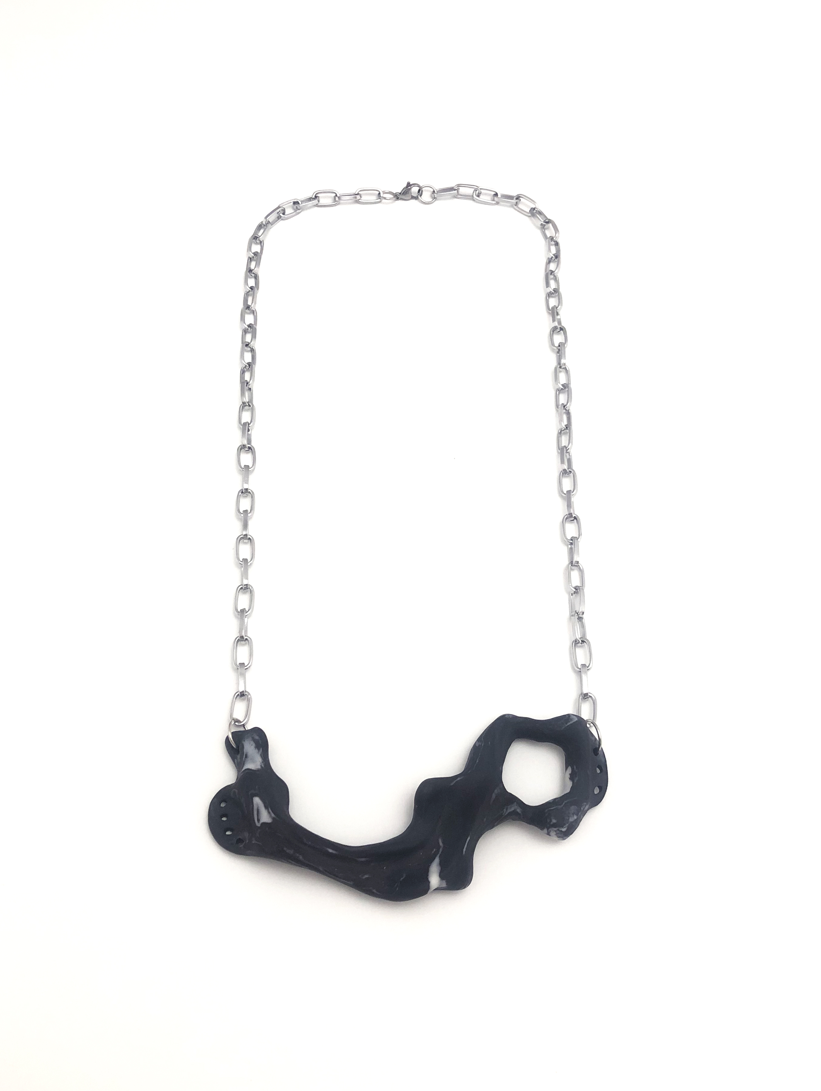 Γλυπτό κολιέ με μαύρη και λευκή πορσελάνη με ασημί αλυσίδα αλουμινίου.